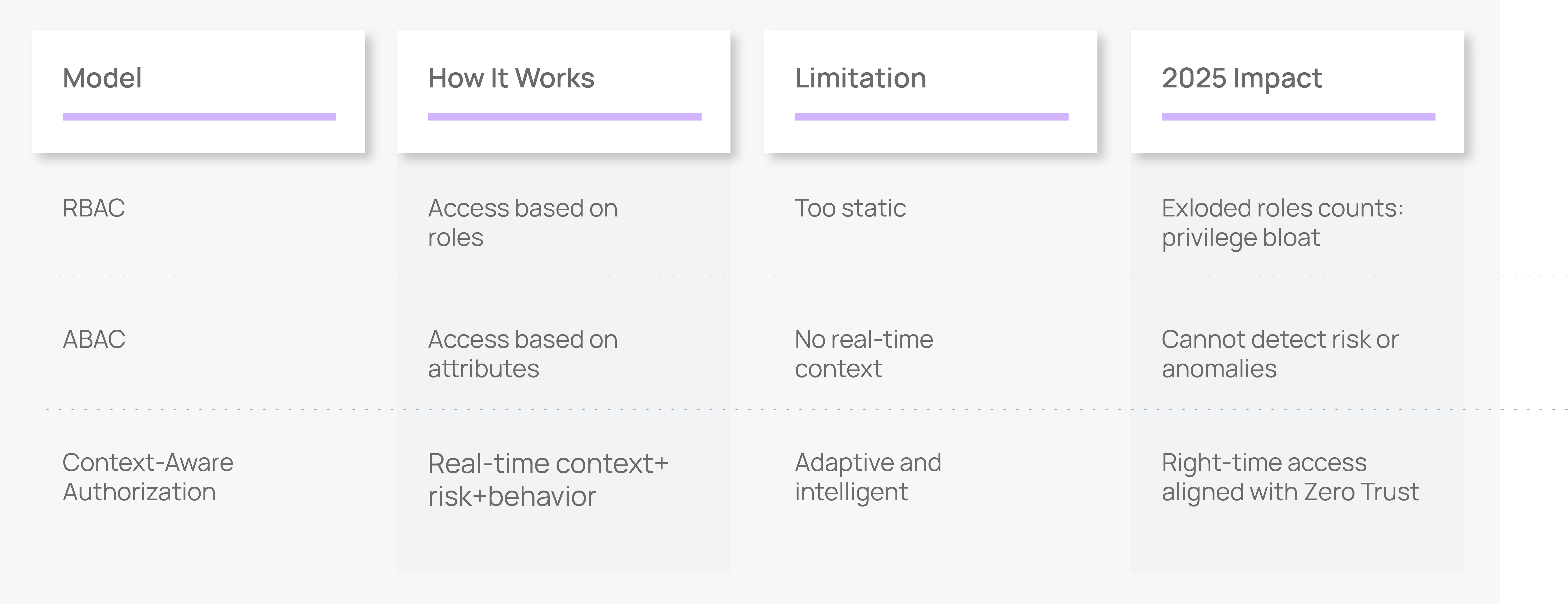 As enterprise environments become more dynamic and threat-driven, traditional authorization models struggle to balance access and risk. The following comparison highlights why organizations are moving beyond static and attribute-only controls toward context-aware authorization.