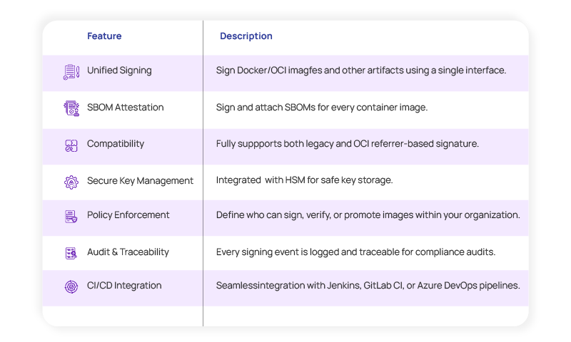 Nusummit’s CodeSign addresses these pain points by providing a centralized, policy-driven platform for secure image signing and attestation. Features include: