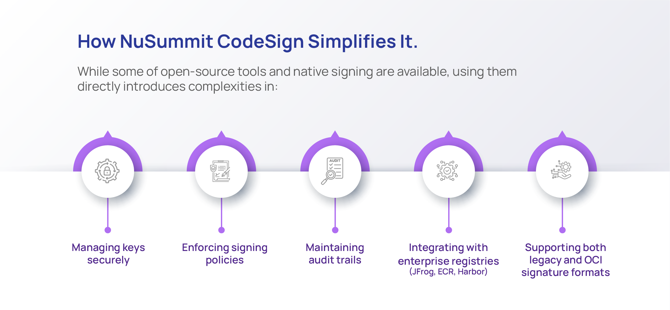 Image signing and SBOM attestation aren’t just nice-to-have features anymore—they’re foundational for securing a modern software supply chain. Enterprise-ready solutions like NuSummit CodeSign give organizations: