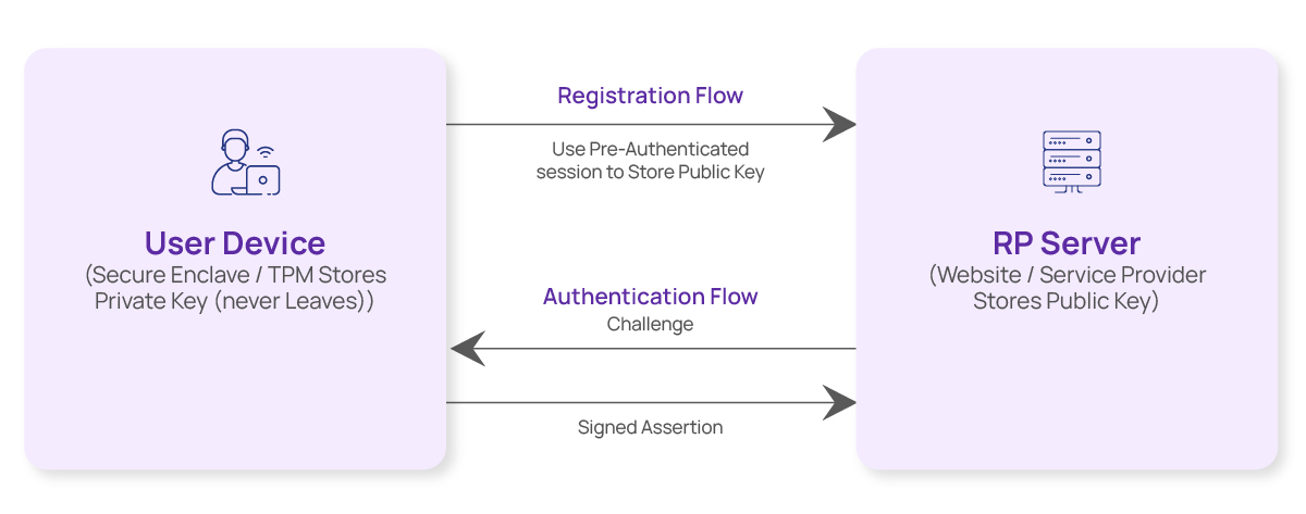 The private key never leaves the device (Protected by Secure Enclave/TPM). When you log in, the service provider’s website or Relying Party (RP) server sends a cryptographic challenge. Your device signs this challenge using the private key, after biometric or PIN verification, and returns a signed assertion bound to the origin and domain.